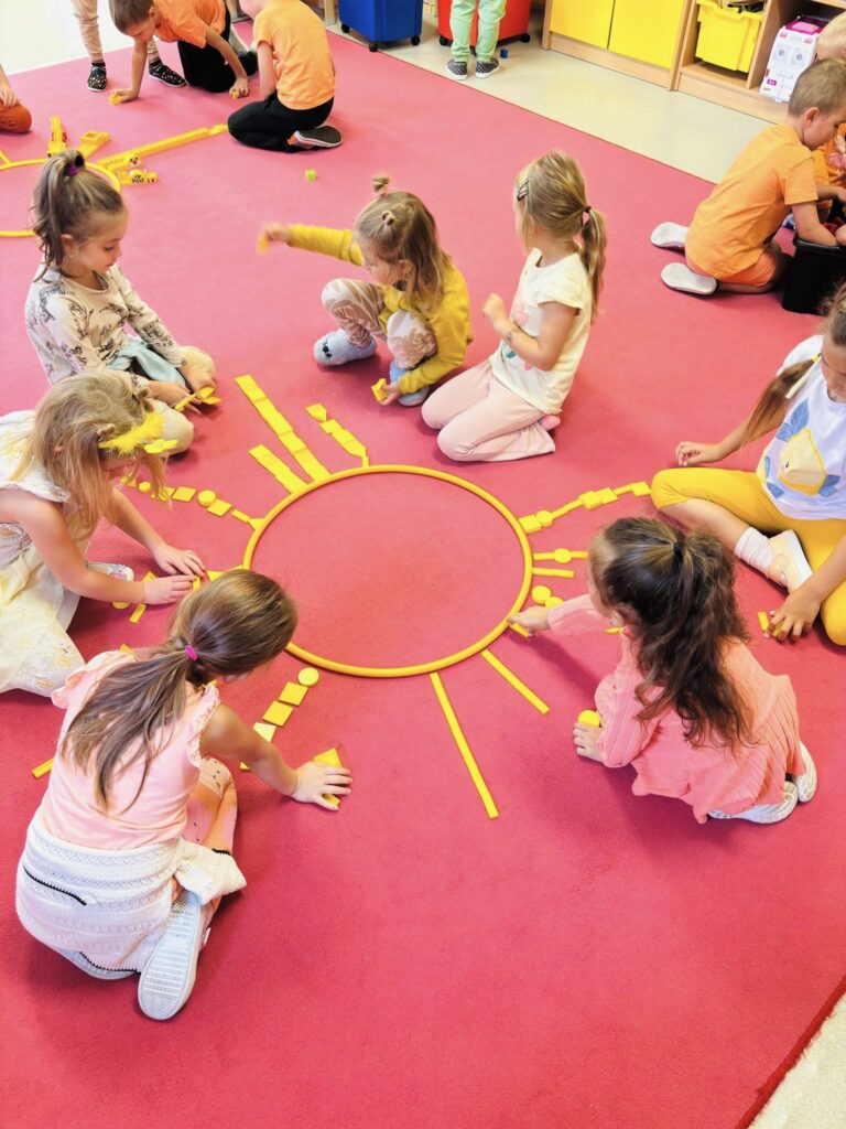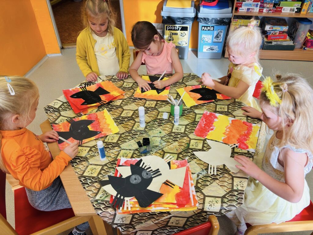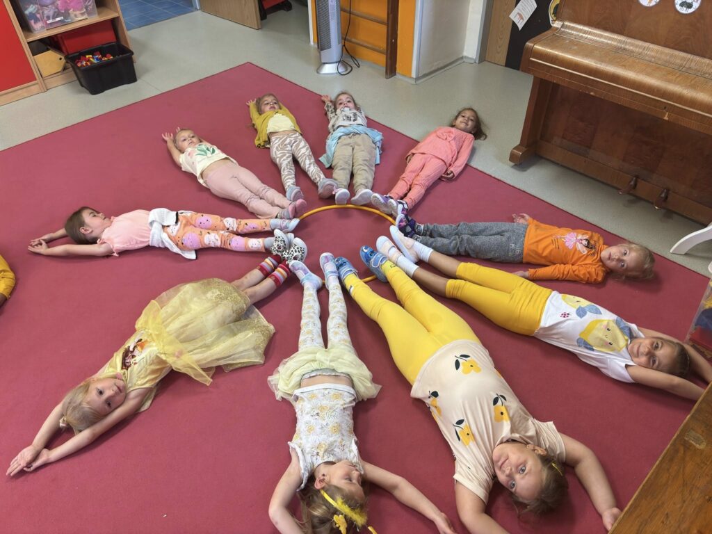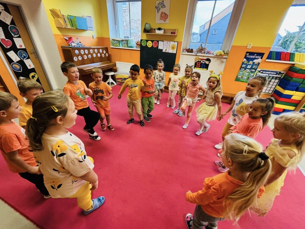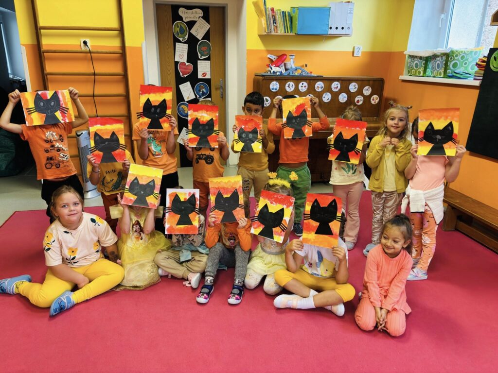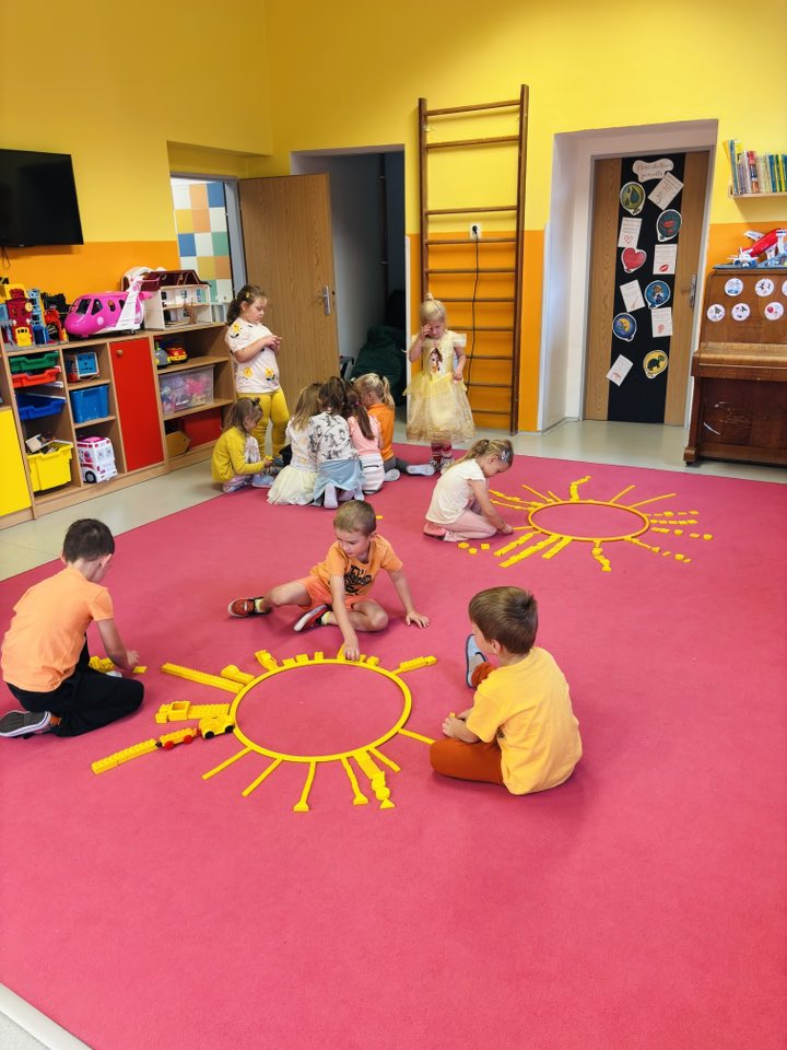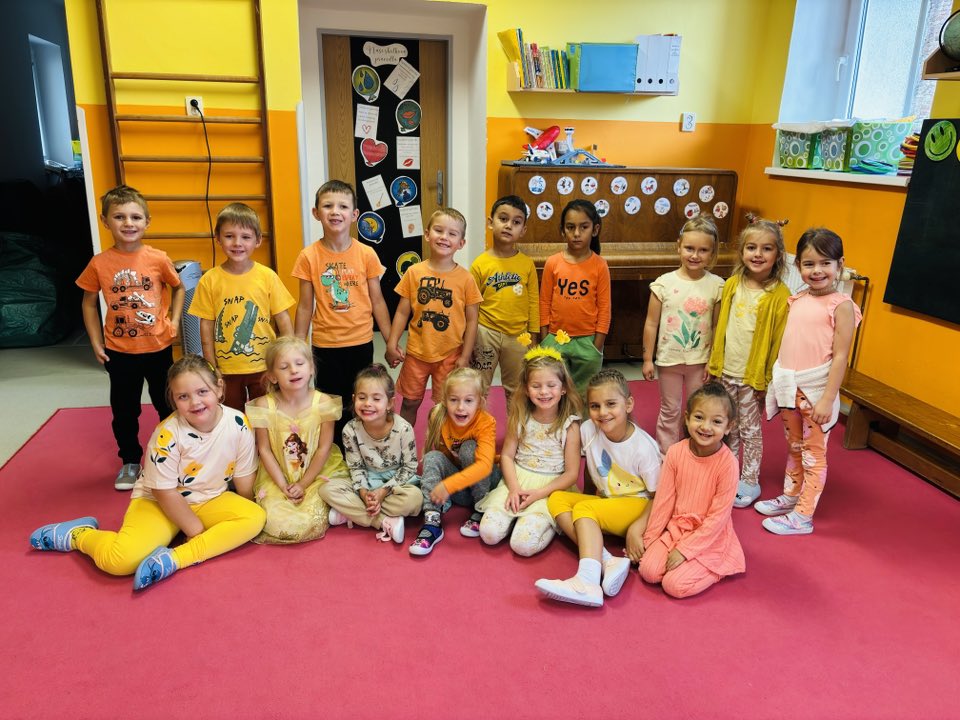 Celým dnem nás provázely dvě krásné barvy – oranžová a žlutá. Barvy jsme třídili, správně pojmenovali, hledali je ve třídě – hra “Čáp ztratil čepičku”, povídali jsme si o tom, co známe oranžového a co žlutého. Zahráli jsme si pohybovou hru “Sluníčka”, sluníčko jsme také stavěli z geometrických tvarů i ze svých těl. Pracovali jsme s barvami a vyrobili krásné obrázky, které nám zdobí šatnu. Celé dopoledne zakončila barevná módní přehlídka.