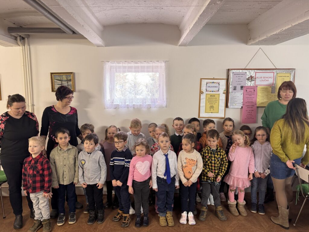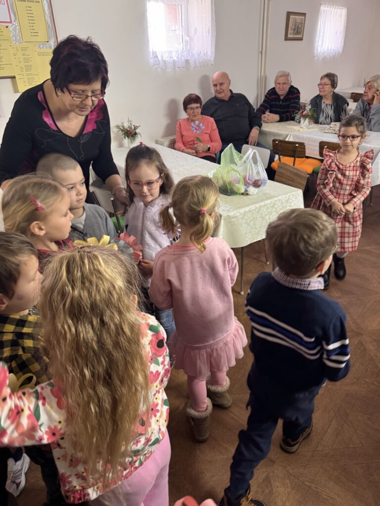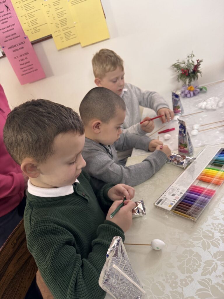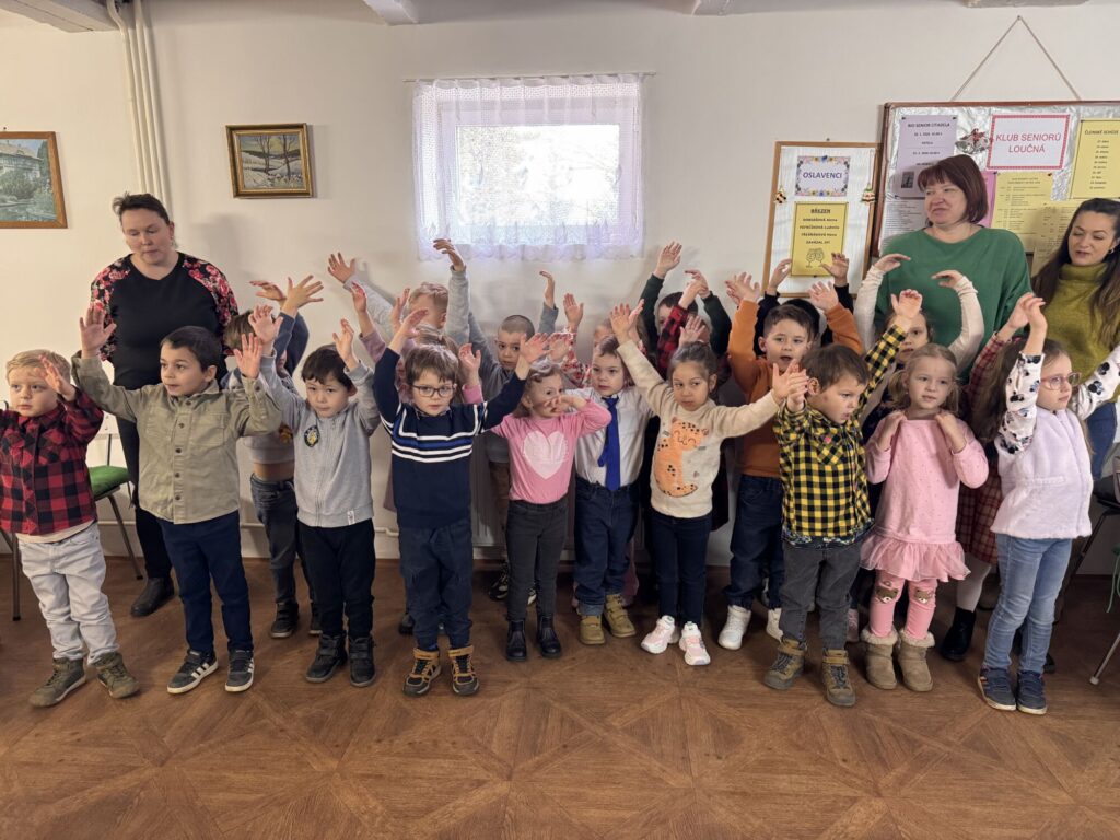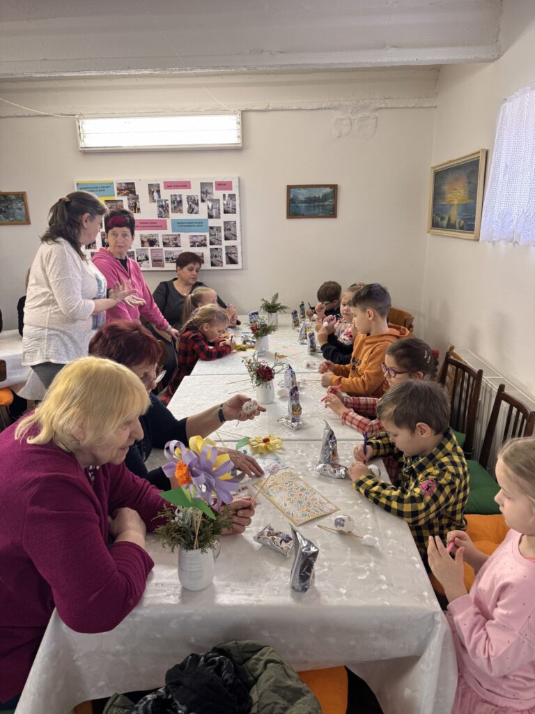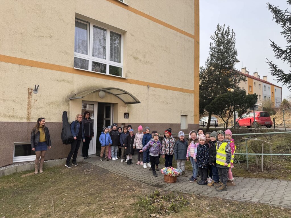 Děti zazpívaly písničky o kytičkách a jaru, rozdaly vyrobené kytičky z barevného papíru a tím tak všechny potěšily. Společně si se seniory zahráli různé hry, ozdobili velikonoční vajíčka a obdrželi malé pohoštění. Děkujeme moc za pozvání a budeme se těšit na další společné chvíle.